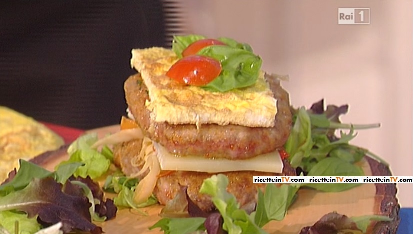 Tagliamo verza e peperoni a listarelle e li facciamo appassire in padella, con del finocchietto ed un filo d’olio. Per la panure, mescoliamo il pangrattato al concentrato di pomodoro, l’erba cipollina, la buccia grattugiata del limone ed un filo d’olio. Prendiamo il macinato e lo condiamo con sale e pepe. Diamo la forma del burger e lo passiamo nella panure. Scaldiamo un filo d’olio in padella e saltiamo, coprendo con il coperchio, i burger. Lasciamo cuocere fino a doratura. Prepariamo anche una frittatina semplice. Quindi, componiamo il club burger. Coppiamo la frittata della grandezza del burger. Sovrapponiamo al burger ormai cotto le verdure saltate, una fetta di formaggio montasio, un altro burger, la frittata, delle foglie di basilico, delle fettine di pomodorino ed infilziamo con degli stuzzicadenti. Serviamo con della misticanza.