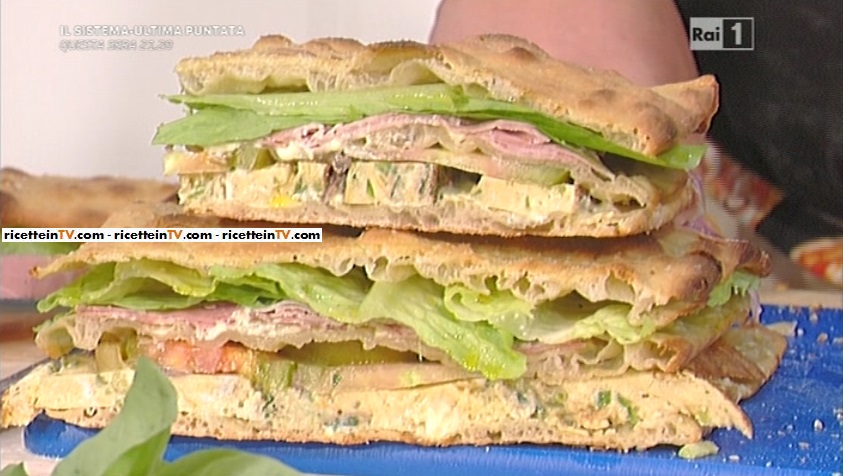 Otterremo tre strati separati. Farciamo il primo strato con poca maionese, frittata di zucchine a fette, acciughine sott’olio e fette di pomodoro; copriamo con un altro strato di focaccia e spalmiamo ancora con maionese, disponiamo sopra il prosciutto cotto affettato e le foglie di lattuga, olio, sale e pepe; copriamo con l’ultimo strato di focaccia. Tagliamo a triangoli.