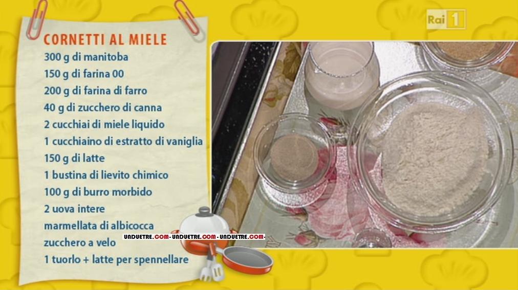 Vi proponiamo una gustosa ricetta realizzata in una delle ultime edizioni de La prova del cuoco. Anna Moroni è pronta ad impartire, come consuetudine, le lezioni di piccola pasticceria casalinga. Dopo aver ballato la canzoncina che la introduce, prepara dei deliziosi cornetti al miele.