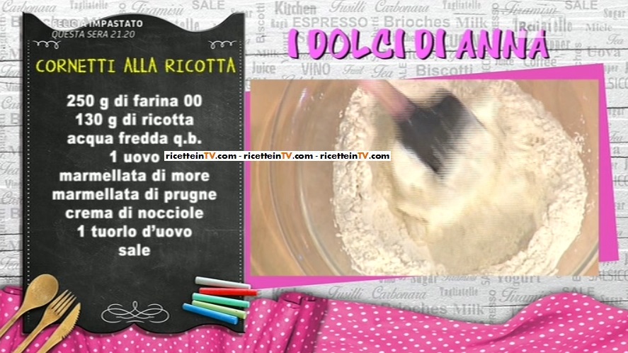 Adesso, il momento più dolce, quello del dolce di Anna Moroni, soddisfatta per il menu proposto quest’oggi. La giusta conclusione è rappresentata dai suoi cornettini: uno stuzzichino dolce, che può anche essere salato. Ecco la ricetta dei cornetti alla ricotta.