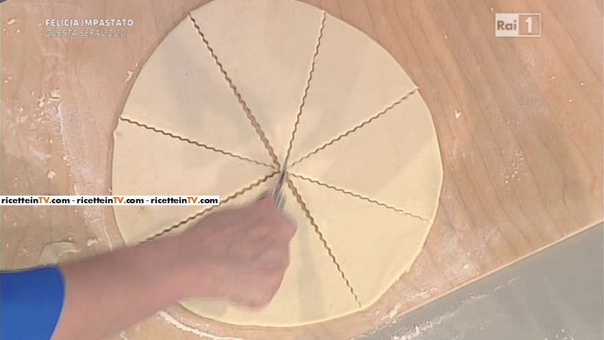 Lavoriamo la farina con la ricotta (meglio se mista, mucca e pecora: è più saporita), l’uovo e, pian piano, l’acqua: non dobbiamo abbondare: dobbiamo raggiungere la consistenza di una frolla, in modo da ottenere un panetto compatto. Non utilizziamo zucchero, quindi quest’impasto può essere usato anche per degli stuzzichini salati. Copriamo con la pellicola e la lasciamo riposare in frigorifero. Stendiamo il composto, in modo da ottenere un disco alquanto sottile. Ritagliamo un cerchio perfetto, come fosse la base di una torte. Con un tagliapasta, ritagliamo dei triangoli dal disco (foto). Alla base di ciascun triangolo, mettiamo un cucchiaino di ripieno (marmellata o crema di nocciole); arrotoliamo stretto, in modo da ottenere i cornettini; spennelliamo con il tuorlo d’uovo e inforniamo a 180° per 15-20 minuti: devono dorarsi leggermente. Completiamo con zucchero a velo.