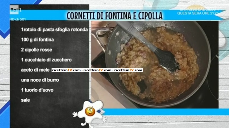 - 1 rotolo di pasta sfoglia rotonda, 100 g fontina, 2 cipolle rosse, 1 cucchiaio di zucchero, aceto di mele, una noce di burro, 1 tuorlo d’uovo, sale