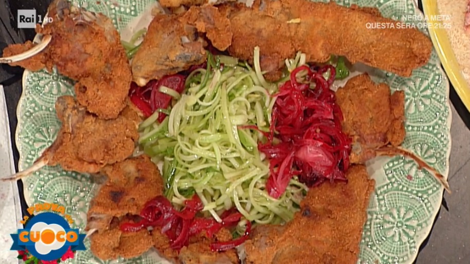 - 10 costolette scalzate, 300 g farina, 4 uova, 300 g pangrattato, 300 g puntarelle, 1 bicchiere di aceto bianco, 2 spicchi d’aglio, 4 acciughe sott’olio, 2 cipolle rosse, 1 bicchiere di aceto rosso, olio evo, sale, pepe, zucchero