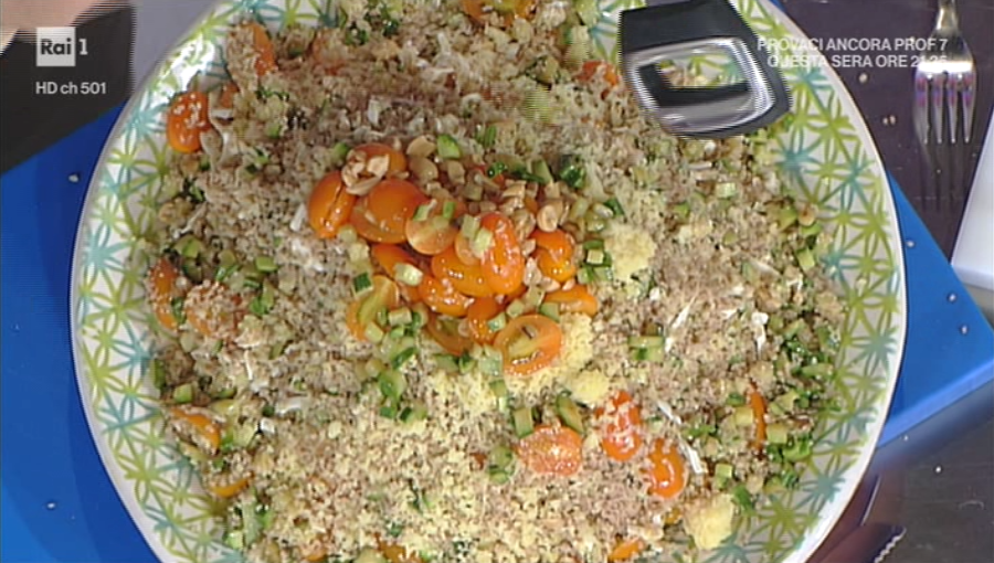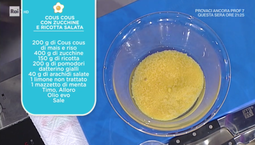 - 200 g cous cous di mais e riso (o di grano), 400 g zucchine, 150 g ricotta, 200 g pomodori datterino gialli, 40 g arachidi salate, 1 limone non trattato, 1 mazzetto di menta, timo, alloro, olio evo, sale