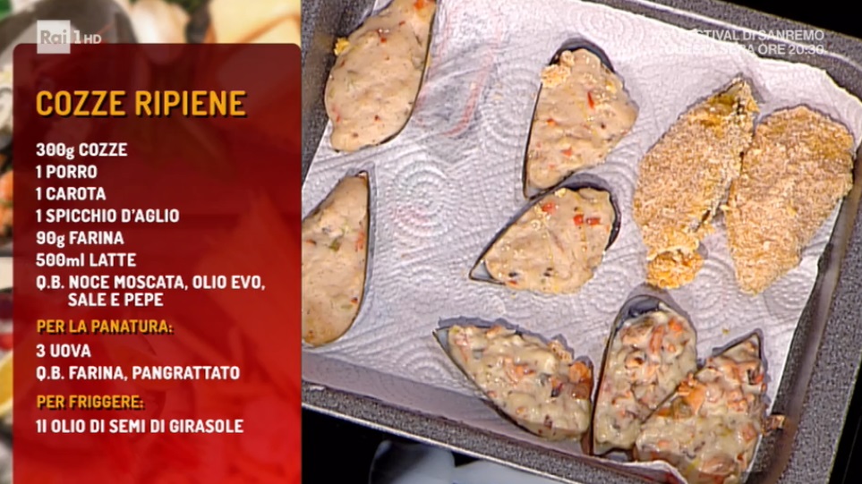 Con il ripieno ottenuto, farciamo una metà del guscio delle cozze. Lasciamo raffreddare per mezz’ora. A questo punto, passiamo le cozze nella farina, nelle uova sbattute con un pizzico di sale e infine nel pangrattato. Friggiamo in olio caldo e profondo, fino a doratura.