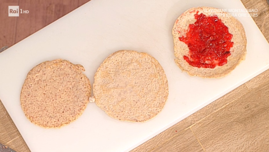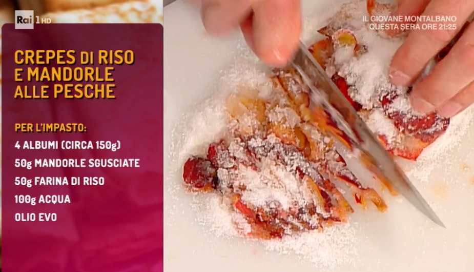 Per le crepes, mettiamo nel bicchiere del mixer gli albumi, l’acqua e le mandorle sgusciate (con la pelle o senza) e frulliamo con il mixer ad immersione. Quando le mandorle sono tritate, aggiungiamo la farina di riso, un pizzico di sale e frulliamo ancora. Coliamo l’impasto, con un mestolo, su una padella unta d’olio e lasciamo cuocere la crepe sui due lati.