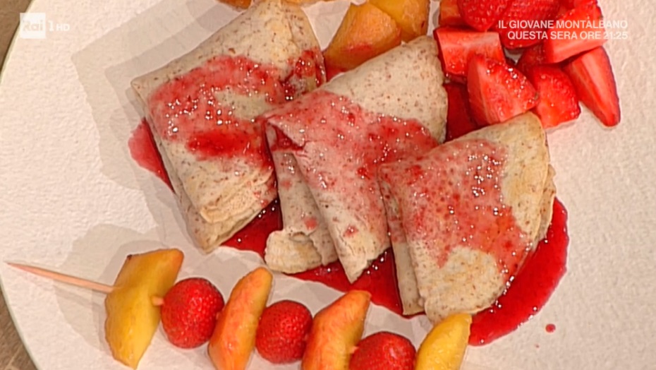 Su ciascuna crepe, spalmiamo sopra la confettura di buccia di pesca. Ripieghiamo a fazzoletto, quindi serviamo con frutta fresca e coliamo sopra la salsa alle fragole.