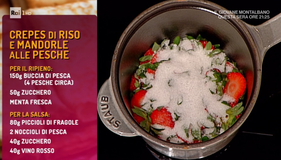 - Salsa: 80 g piccioli di fragole, 2 noccioli di pesca, 40 g zucchero, 40 g vino rosso