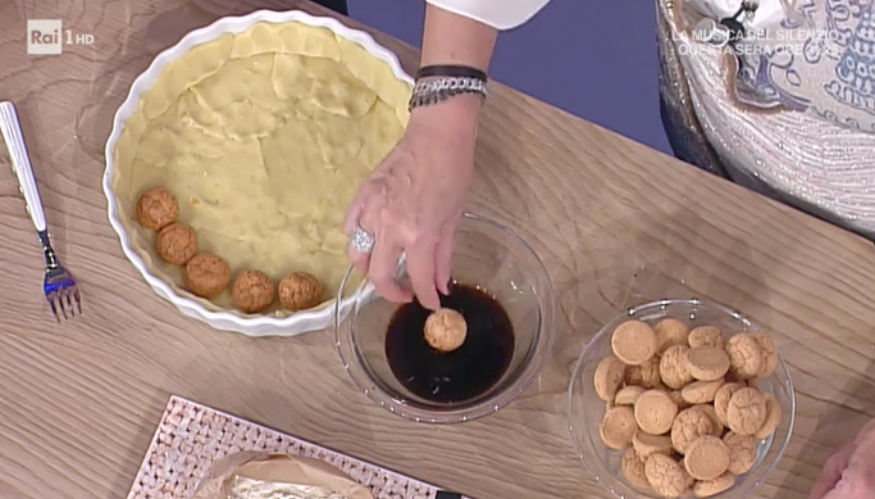 Facciamo il caffè e lo lasciamo raffreddare. Intingiamo velocemente gli amaretti secchi nel caffè (o nel rum) e li disponiamo sul fondo della crostata ancora crudo. Versiamo sopra il composto alle mandorle. Lo distribuiamo uniformemente ed inforniamo a 175° per 45 minuti.
