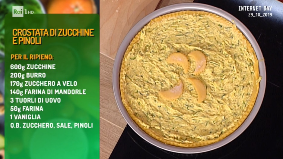 crostata di zucchine e pinoliChiudiamo in dolcezza con l’originale proposta di Daniele Persegani, che oggi compie 47 anni. Il cuoco emiliano propone un dolce a base di zucchine, ovvero la crostata di zucchine e pinoli.
