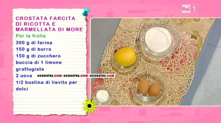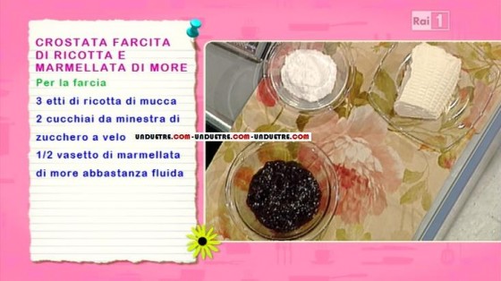 Vi proponiamo una gustosa ricetta realizzata in una delle ultime edizioni de La prova del cuoco. ‘Il ballo della casalinga‘ introduce una scatenata Anna Moroni alle prese, anche quest’oggi, con la sua piccola pasticceria casalinga. Annina prepara una torta la cui ricetta le è stata mandata da una telespettatrice, Gessica dalla provincia di Siena, ovvero la crostata farcita di ricotta e marmellata di more.