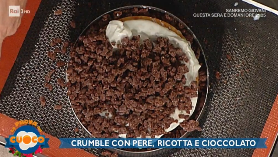 Passiamo al crumble: in planetaria, mettiamo il burro freddo a cubetti, il sale, lo zucchero di canna (200 g), la farina 00, il cacao amaro in polvere e la fava di cacao tritata e tostata qualche minuto in forno. Lavoriamo con la foglia fino ad ottenere un composto omogeneo. Lo sbricioliamo su una teglia con carta forno, quindi mettiamo a riposare in frigorifero per 3 ore e lo passiamo in freezer ancora per un po’, fino a congelarlo. Ne inseriamo 2/3, ancora congelato, all’interno di una tortiera o un anello, coprendo il fondo e formando il bordo. Formiamo sul fondo uno strato di ricotta e adagiamo sopra il dischetto di pere caramellate. Copriamo le pere con altra ricotta. Finiamo con il crumble rimasto, che facciamo ben aderire. Inforniamo a 170° per 25 minuti.