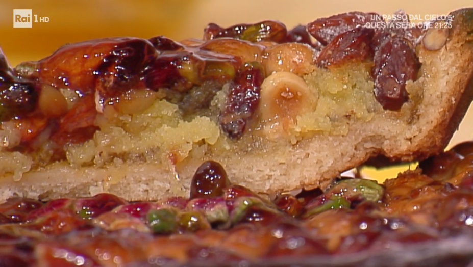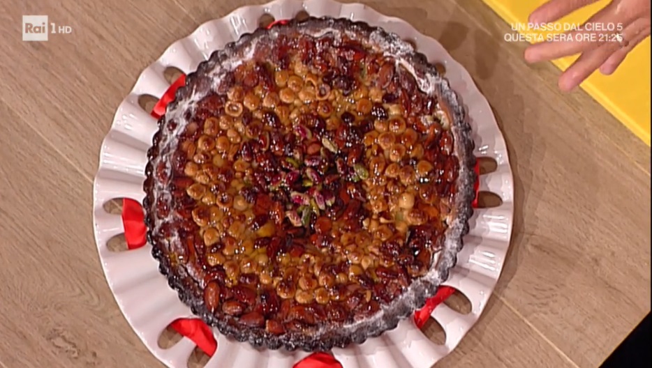 Spalmiamo sulla base di frolla ancora cruda la marmellata di arance (se vogliamo prepararla in casa, mettiamo la polpa delle arance in un pentolino con succo d’arancia, zucchero e stecca di cannella; lasciamo cuocere per mezz’ora, quindi frulliamo ad immersione con un mixer). Distribuiamo sopra, in bell’ordine, la frutta secca mista. Cuociamo in forno preriscaldato e statico a 165° per 35-40 minuti. Appena sfornata, la spennelliamo con del miele. Natale consiglia di servirla tiepida (la scaldate, prima di servirla, in forno a 45°).