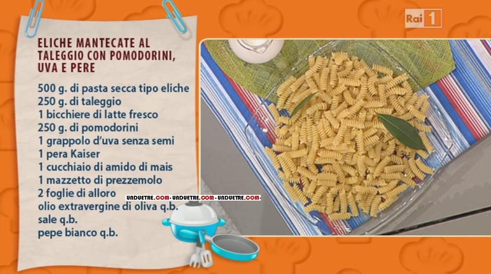 Vi proponiamo una gustosa ricetta realizzata in una delle ultime edizioni de La prova del cuoco. ‘L’appetito vien mangiando..‘ introduce il maestro in cucina di oggi, che non può che essere Mr alloro Sergio Barzetti. Ad Antonella si illumina lo sguardo alla vista del taleggio, che adora. Sergio, infatti, prepara le eliche mantecate al taleggio con pomodorini, uva e pere.