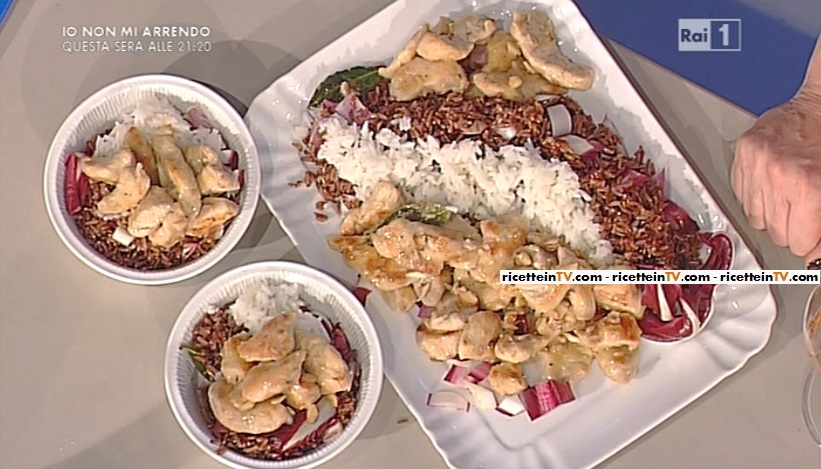 Lessiamo il riso in acqua salata e profumata d’alloro; la varietà usata da Sergio richiede circa 35 minuti di cottura. In padella, scaldiamo un filo d’olio; intanto, tagliamo a tocchetti il tacchino e li infariniamo; passiamo il tacchino in padella, con l’olio; facciamo rosolare per bene. Quando è ben dorato su tutti i lati, uniamo le mandorle tritate grossolanamente (e con la pelle); lasciamo insaporire un po’, quindi sfumiamo col succo di mele; lasciamo addensare, mantenendo sul fuoco per qualche minuto; saliamo e pepiamo. Scoliamo il riso, lo passiamo sotto l’acqua e lo scaldiamo in padella, con un filo d’olio, del radicchio tagliato a tocchetti ed un pizzico di sale. Bastano pochi istanti, il radicchio rimane croccante. Serviamo il tacchino con il riso al radicchio.