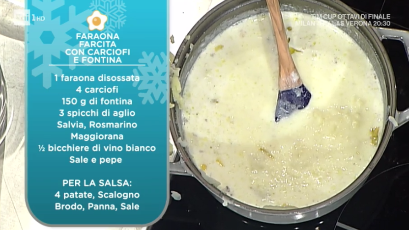 faraona farcita con carciofi e fontina di Anna MoroniCome ogni mercoledì, in cucina arriva il ciclone Moroni. L’infaticabile Annina prepara un secondo delle feste ricchissimo e raffinato. Prepariamo la faraona farcita con carciofi e fontina.