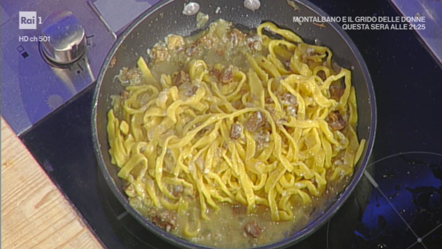 Prepariamo la pasta fresca con metà farina 0 e metà farina di semola rimacinata. Impastiamo con le uova e, se serve, un goccio d’acqua. Lasciamo riposare mezz’ora, coperta, quindi tiriamo la sfoglia sottile e tagliamo le fettuccine. Lessiamo in acqua salata e scoliamo al dente.