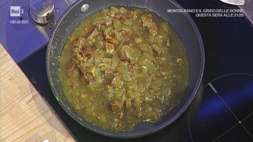Tagliamo il pezzo di lesso (il castrato) a pezzetti. Affettiamo la cipolla rossa sottile. In un tegame, mettiamo a soffriggere la cipolla ed il lesso a pezzetti con un generoso filo d’olio. Dopo qualche minuto, aggiungiamo gli aromi: cumino ed alloro. Bagniamo con il vino e lasciamo cuocere, coperto, per circa 4 ore (!). Otterremo una sorta di crema.