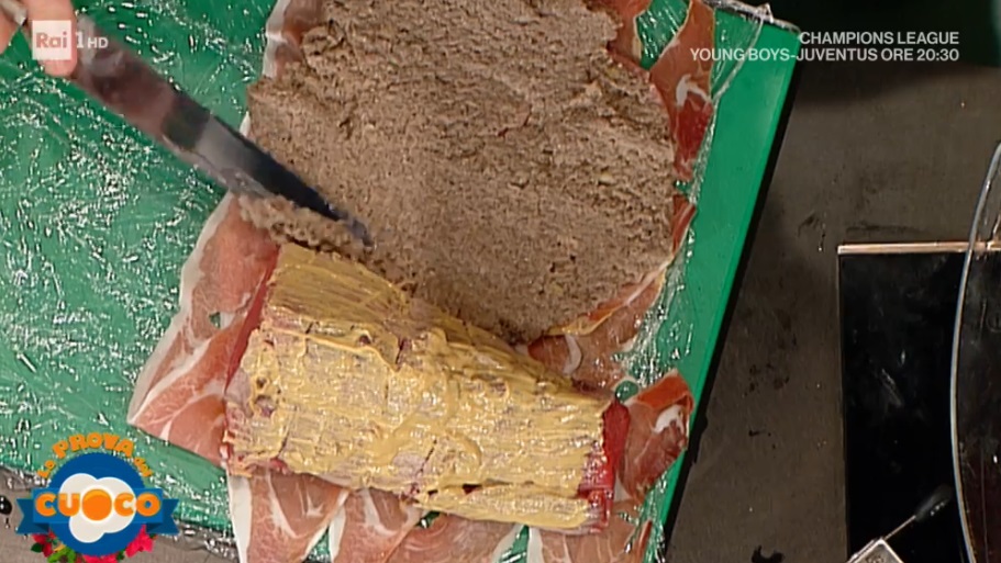Su un foglio di pellicola, adagiamo le fettine di prosciutto crudo, sovrapponendole un po’. Adagiamo su un lato il filetto scottato e lo spennelliamo con la senape. Sull’altro lato, spalmiamo la crema di funghi. Arrotoliamo il filetto con il prosciutto, aiutandoci con la pellicola. Chiudiamo bene la pellicola e lasciamo che prensa la forma.
