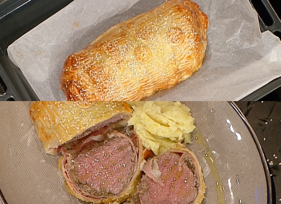- 2 Kg filetto di manzo, 300 g prosciutto crudo, 500 g funghi champignon, 5 castagne bollite, 1 rotolo di pasta sfoglia, 500 g patate, 200 g burro, senape, olio evo, sale, semi di sesamo