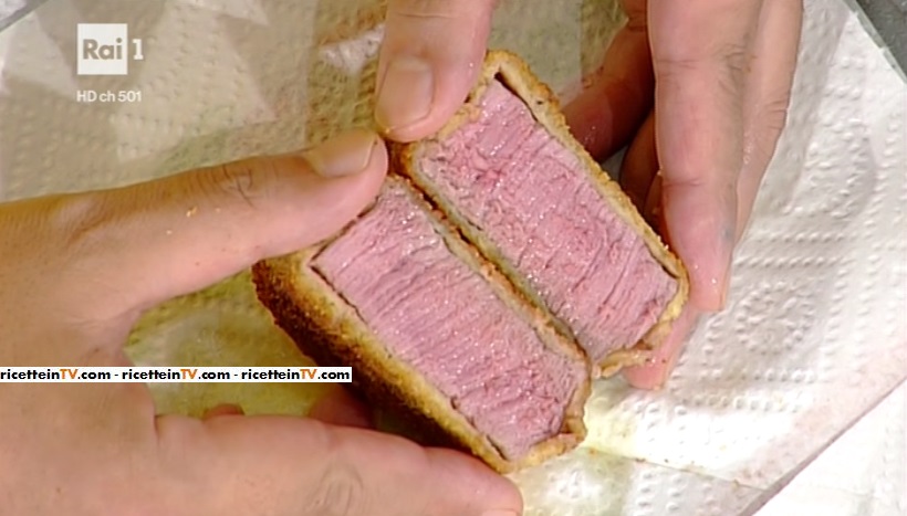 Compriamo dei medaglioni di manzo. Li saliamo, quindi li infariniamo leggermente, togliendo l’eccesso. Passiamo i medaglioni infarinati nell’uovo sbattuto, quindi nel pangrattato. Ripassiamo nell’uovo, quindi nel pangrattato una seconda volta. In padella, scaldiamo un generoso filo d’olio con uno spicchio d’aglio e delle erbe aromatiche (rosmarino e salvia). Mettiamo a cuocere i nostri medaglioni. Dovrà cuocere, in totale, per circa 10 minuti. Quando abbiamo rosolato su entrambi i lati, aggiungiamo un tocco di burro e portiamo a cottura. Hiro svela un trucco: per verificare la cottura, inseriamo uno stecchino di legno al cuore del filetto. Dopo qualche minuto, poggiamo lo stecchino sulle labbra: deve scottare un po’ (circa 45°).