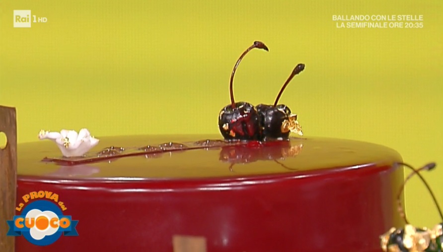 Per la glassa, portiamo a 165° il succo delle amarene con il glucosio e lo zucchero. A parte, portiamo a bollore la panna con il cacao. Quando lo sciroppo di amarena e zucchero è a temperatura, uniamo a filo la panna bollente, mescolando nel frattempo (attenzione a quest’operazione!). Versiamo quindi sul cioccolato tritato e frulliamo con il mixer ad immersione. Uniamo quindi la gelatina reidratata in acqua e frulliamo ancora. Uniamo, alla fine, il colorante rosso e mixiamo. Mettiamo in frigorifero a stabilizzare, quindi utilizziamo a 40° circa.
