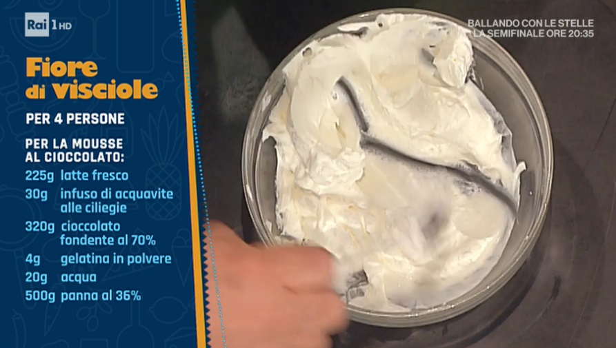 - Mousse al cioccolato: 225 g latte, 30 g kirsch, 320 g cioccolato al 70%, 4 g gelatina in polvere, 20 g acqua, 500 g panna