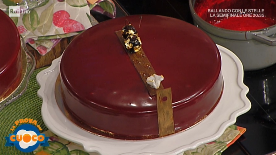 - Glassa: 150 g zucchero, 120 g glucosio, 280 g sciroppo di visciole o amarene, 420 g panna, 2,5 g colorante rosso fragola idrosolubile, 18 g gelatina in polvere, 90 g acqua, 72 g cioccolato fondente al 70%