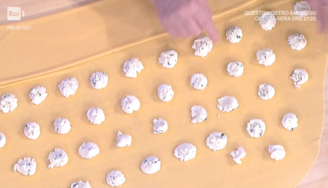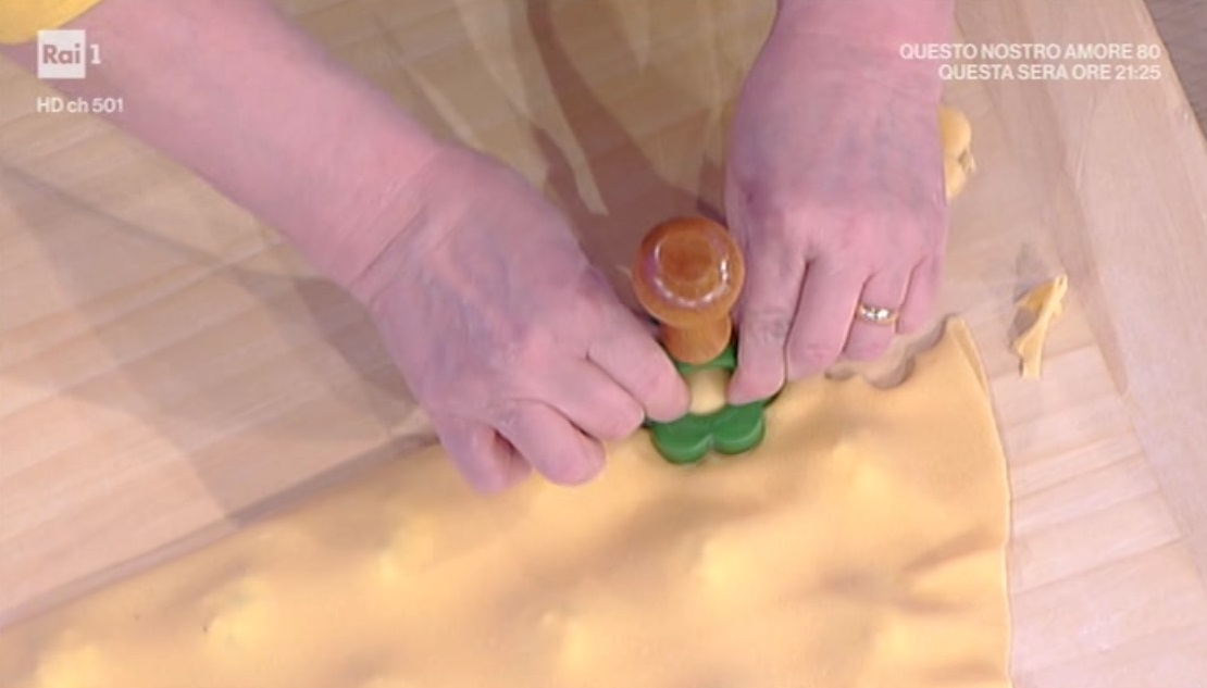 Prepariamo la farcia amalgamando la ricotta con le foglie di basilico spezzettate, un uovo, il formaggio grattugiato, un pizzico di noce moscata e di sale. Mettiamo nel sacco a poche e farciamo metà della sfoglia tirata con mucchietti di ripieno distanziati tra di loro e incrociati. Sovrapponiamo l’altra parte di sfoglia e con l’apposito attrezzo ne ricaviamo i fiorelli che lessiamo in acqua bollente e salata.