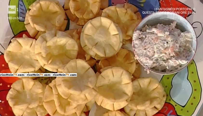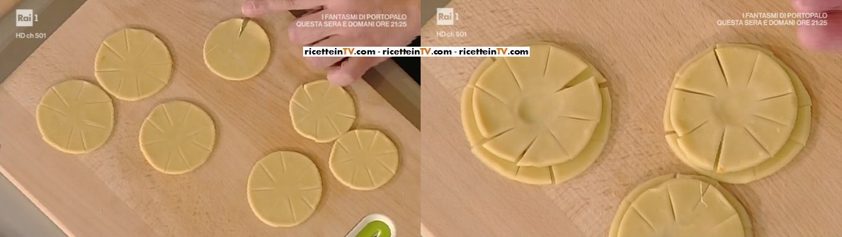 Stendiamo con il mattarello, sottilissimo, circa 1 mm. Ricaviamo con un coppapasta 4 dischi; con un coppapasta leggermente più piccolo ricaviamo altri 4 dischetti. Pratichiamo 8 incisioni sui dischi grandi e, successivamente, sui dischi piccoli, come fossero dei raggi. Bagniamo con poca acqua il centro del disco bianco; sovrapponiamo il disco piccolo e pressiamo con un dito al centro, in modo che si attacchino per bene. Scaldiamo l’olio a 170-180° e tuffiamo i nostri fiori. Quando sono ben dorati, li facciamo sgocciolare su carta assorbente.