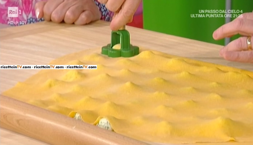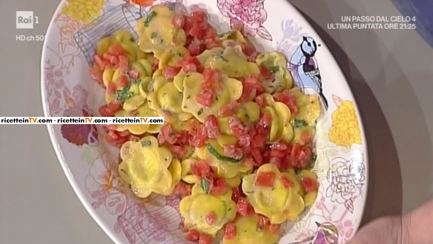 Su metà della sfoglia, formiamo dei ciuffi di ripieno. Copriamo con l’altra metà della sfoglia e pressiamo, in modo da far aderire le due metà e far uscire tutta l’aria. Ritagliamo i fiori con l’apposito stampino. Lessiamo in acqua salata. Scoliamo e condiamo, in una ciotola, con i pomodori e del burro a tocchetti.