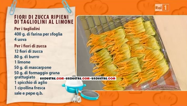 Vi proponiamo una gustosa ricetta realizzata in una delle ultime edizioni de La prova del cuoco. Una scatenata mazurka introduce, come sempre, la simpaticissima cuoca bolognese Alessandra Spisni, anche quest’oggi in compagnia del suo mattarello Luisino. Alessandra, portando in cucina la sua allegria e solarità, prepara i fiori di zucca ripieni di tagliolini al limone.
