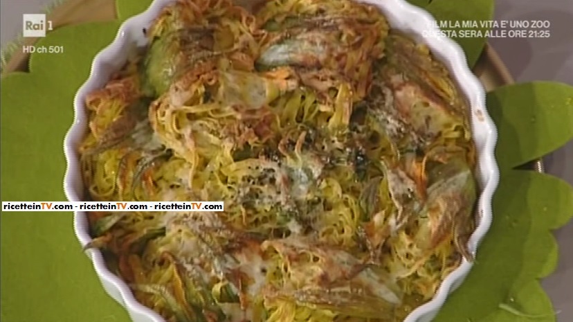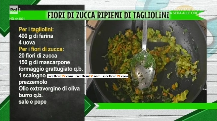 fiori di zucca ripieni di tagliolini di Alessandra SpisniTorna in diretta, dopo un giorno di stop, La prova del cuoco. Si riparte dall’epico duello tra Annina Moroni ed Alessandra Spisni. L’oggetto del contendere sono i fiori di zucchina. Anna propone dei fiori di zucca ripieni e fritti; Alessandra replica con dei fiori di zucca ripieni di tagliolini.