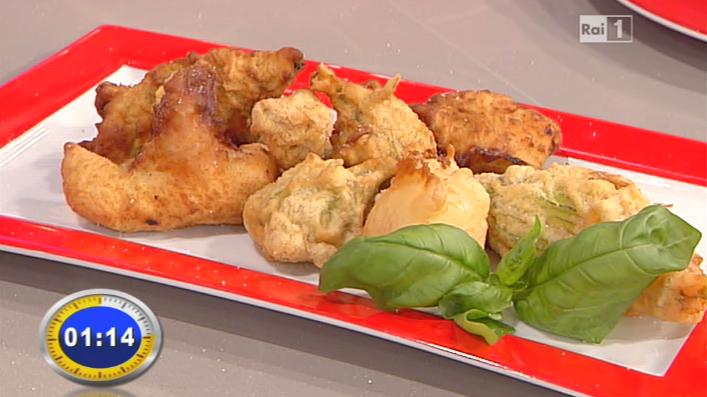 Nella puntata odierna de La prova del cuoco, nel segmento finale, dedicato alla gara tra cuochi, Renato Salvatori ha proposto i fiori di zucca ripieni e fritti con spigola e mozzarella.