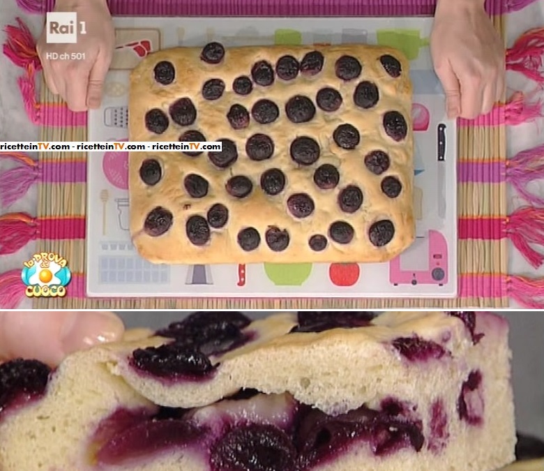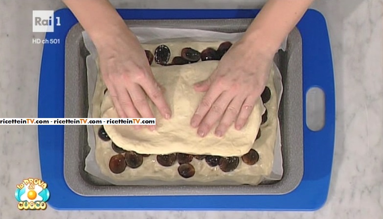 Dividiamo l’impasto in due parti. Ne stendiamo una parte su un foglio di carta forno. Spostiamo in una teglietta e disponiamo sopra metà dell’uva zuccherata. Stendiamo sopra l’altra parte di impasto. Quindi, mettiamo sopra l’uva rimanente. Copriamo col canovaccio e lasciamo lievitare, in luogo caldo, per 15 minuti ancora. Quindi, inforniamo a 190° per 25 minuti.