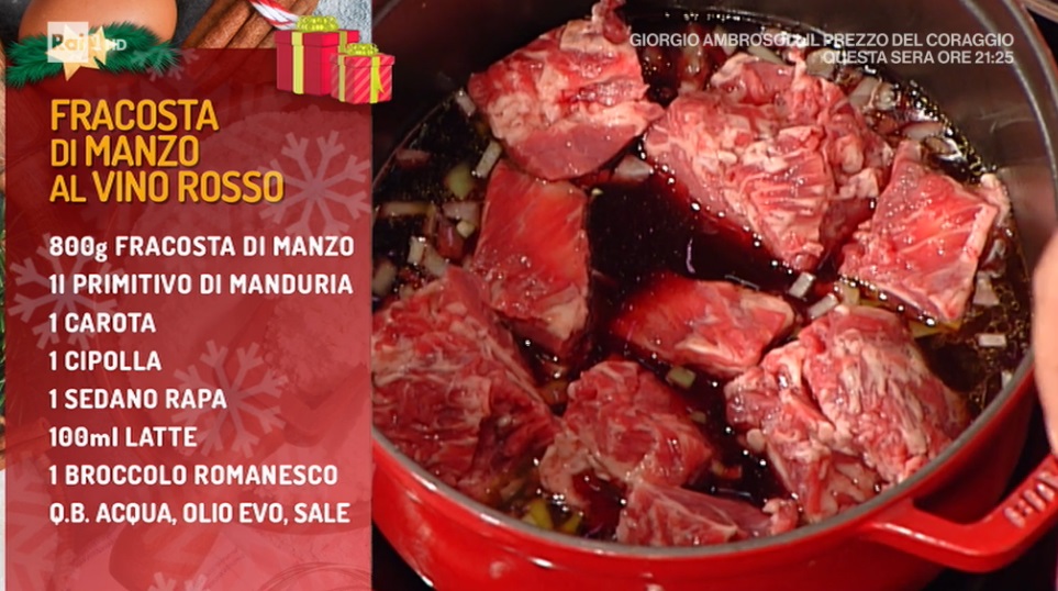 - 800 g fracosta di manzo, 1 l primitivo di manduria (vino rosso), 1 carota, 1 cipolla, 1 sedano rapa, 100 ml latte, 1 broccolo romanesco, acqua, olio evo, sale