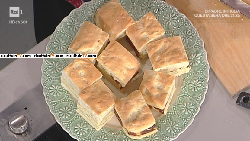 Tagliamo a metà la crescenta e la farciamo con la frittata. Tagliamo a quadratoni.