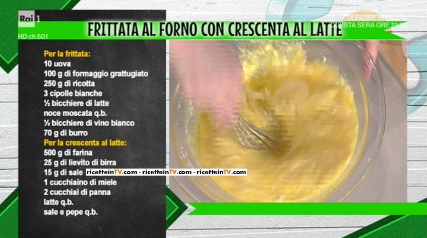 Per la frittata, in una ciotola, mettiamo le uova intere con la ricotta, il formaggio grattugiato, 2 cucchiai di latte e la noce moscata. Mescoliamo con una frusta, quindi aggiungiamo le cipolle ben rosolate. Mescoliamo e trasferiamo in una teglia rettangolare (della stessa dimensione della crescenta) coperta con carta forno e inforniamo a 180°-200° per 30-40 minuti.