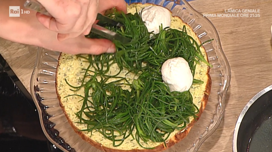 Farciamo il nostro ‘panino di frittata’ con il formaggio fresco a crema e gli agretti conditi. Decoriamo la superficie a piacere.