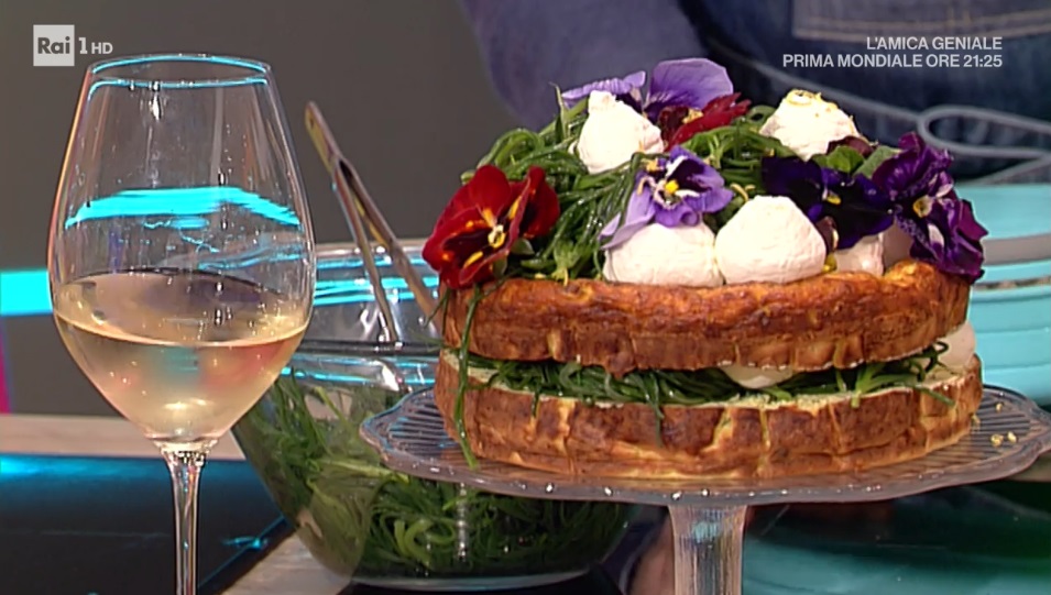 - 10 uova, 150 g ricotta mista, 500 g formaggina fresca (tipo caprino), 60 g formaggio grattugiato, mezzo bicchiere di latte o panna, 1 bergamotto, 1 limone, 1 Kg agretti, fiori di zucchina, menta, maggiorana, timo, burro, olio evo, sale, pepe, viole