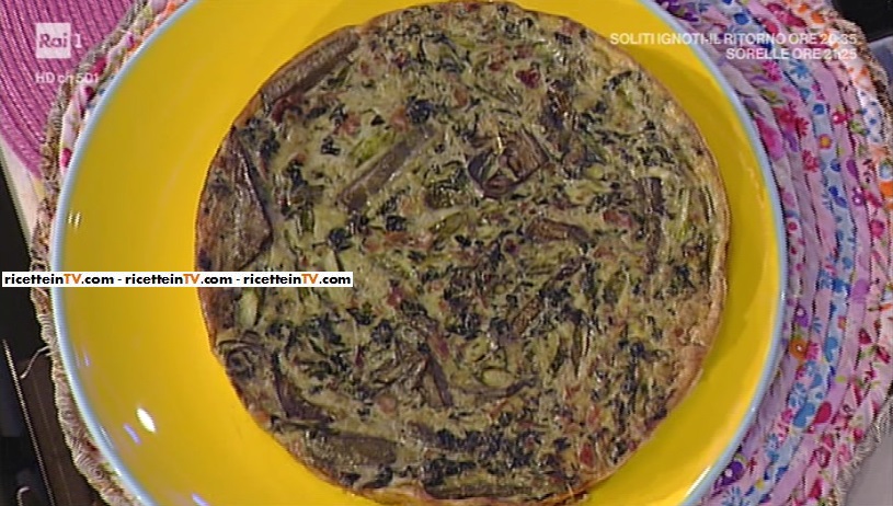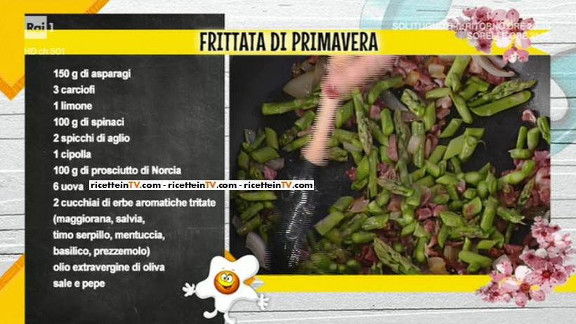 - 150 g asparagi, 3 carciofi, 1 limone, 100 g spinaci, 2 spicchi di aglio, 1 cipolla, 100 g prosciutto di Norcia, 6 uova, 2 cucchiai di erbe aromatiche tritate (maggiorana, salvia, timo serpillo, mentuccia, basilico, prezzemolo), olio evo, sale e pepe