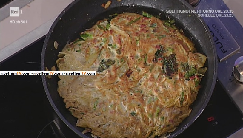 A parte, sgusciamo le uova. Le sbattiamo con del sale ed uniamo i carciofi già cotti. Poi, uniamo anche le verdure saltate. Mescoliamo e rimettiamo in padella. Copriamo e lasciamo cuocere per circa 10 minuti, a fuoco medio basso. Giriamo pochi minuti prima del termine della cottura (possiamo evitare questo passaggio, se ci piace più ‘cremosa’). In alternativa, possiamo cuocerla in forno.