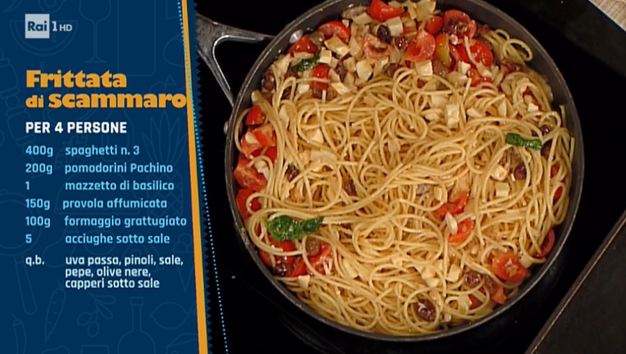 frittata di scammaro di Marisa LauritoOspite speciale della puntata, Marisa Laurito, straordinaria artista e pioniera della cucina in televisione, ha preparato un piatto della cucina povera partenopea, una frittata senza uova. Ecco la frittata di scammaro.