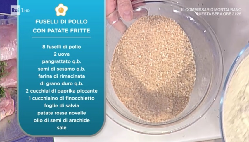 - 8 fuselli di pollo, 2 uova, pangrattato, semi di sesamo, farina rimacinata di grano duro, 2 cucchiai di paprika piccante, 1 cucchiaino di finocchietto, foglie di salvia, patate rosse novelle, olio per friggere, sale