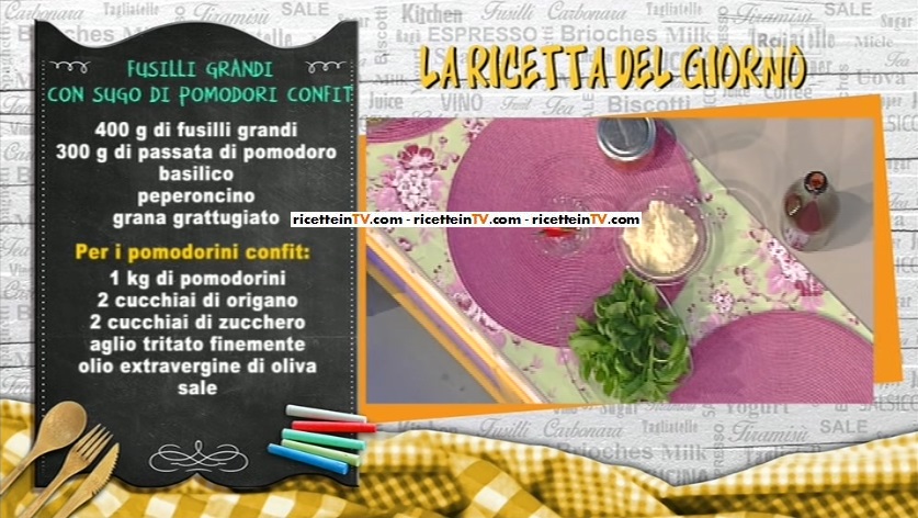 fusilli2Anna Moroni si cimenta nella preparazione di un primo piatto dal sapore estivo; una proposta semplice, ma golosissima. Ecco la ricetta dei fusilli grandi con sugo di pomodori confit.