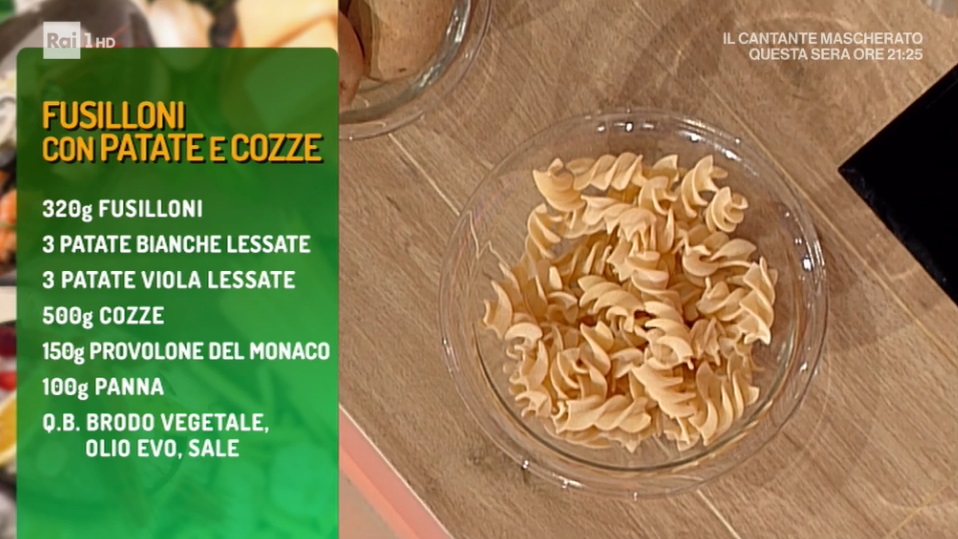 • 320 g fusilloni, 3 patate bianche, 3 patate viola, 500 g cozze, 150 g provolone del monaco, 100 g panna, brodo vegetale, olio evo, sale