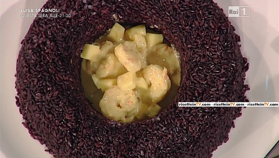 • 16 code di gambero, 300 g di riso nero, 1 lattina di latte di cocco, zenzero fresco qb, 1 mela golden, curry in polvere qb, olio extravergine di oliva, sale e pepe qb