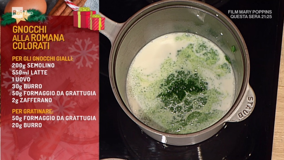 - Gnocchi gialli: 200 g semolino, 550 ml latte, 1 uovo, 30 g burro, 50 g formaggio da grattugia, 2 g zafferano in polvere