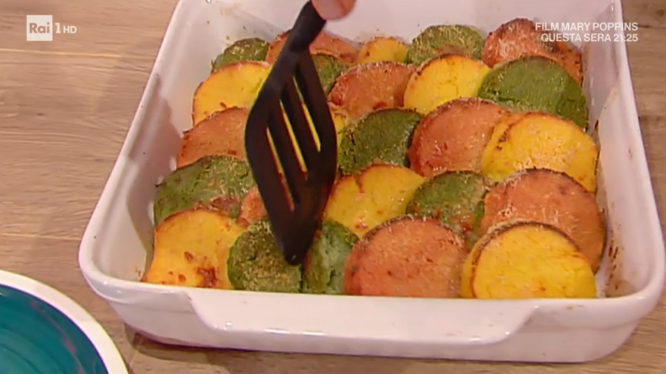Stendiamo i tre composto all’interno di tre teglie distinte, in modo da ottenere uno strato alto un cm circa. Lasciamo raffreddare. Con un coppapasta ricaviamo dei dischetti dai tre composti colorati. Disponiamo, all’interno di una pirofila imburrata, i dischetti, alternando i colori e sovrapponendoli leggermente. Spolveriamo con abbondante formaggio grattugiato e finiamo con il burro a fiocchi. Passiamo in forno caldo e statico a 200° per 15 minuti.