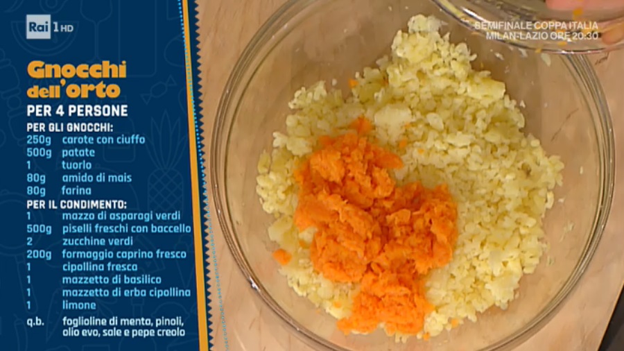 - Gnocchi: 250 g carote con ciuffo, 500 g patate, 1 tuorlo, 80 g amido di mais, 80 g farina
